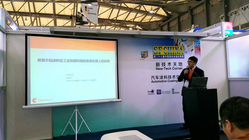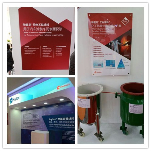美國“科慕”盛裝亮相本屆展覽會,展出koytox全氟潤滑材料、特富龍導電不粘涂料用于汽車涂裝車間表面脫漆等相關產品,并現場向大家新型不粘涂料在工業防腐和橡膠表面處理上的應用。