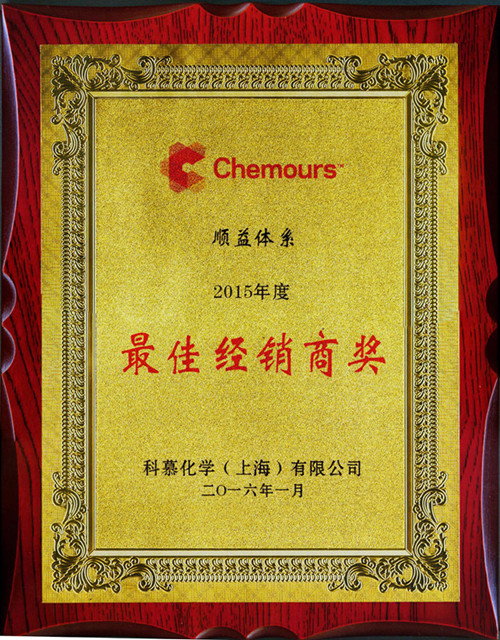 在充滿挑戰的2015年里,順益體系(集團)業績表現突出,榮獲科慕最佳經銷商獎。順益體系(集團)作為杜邦多年的良好戰略合作伙伴,順益榮獲科慕最佳經銷商獎,為雙方今后的合作奠定了更牢固的基礎,這標志著順益與科慕未來將會更緊密的合作。