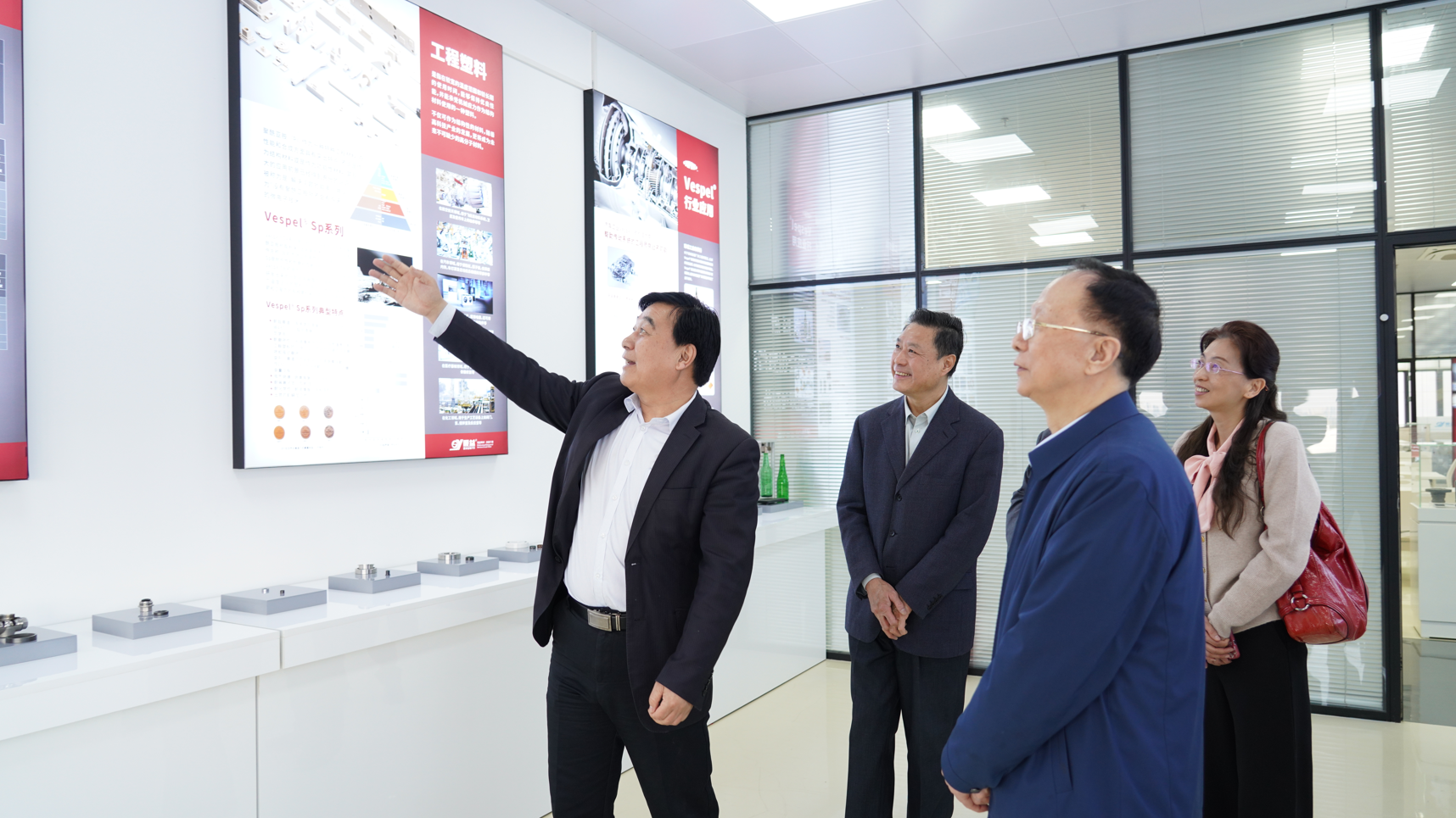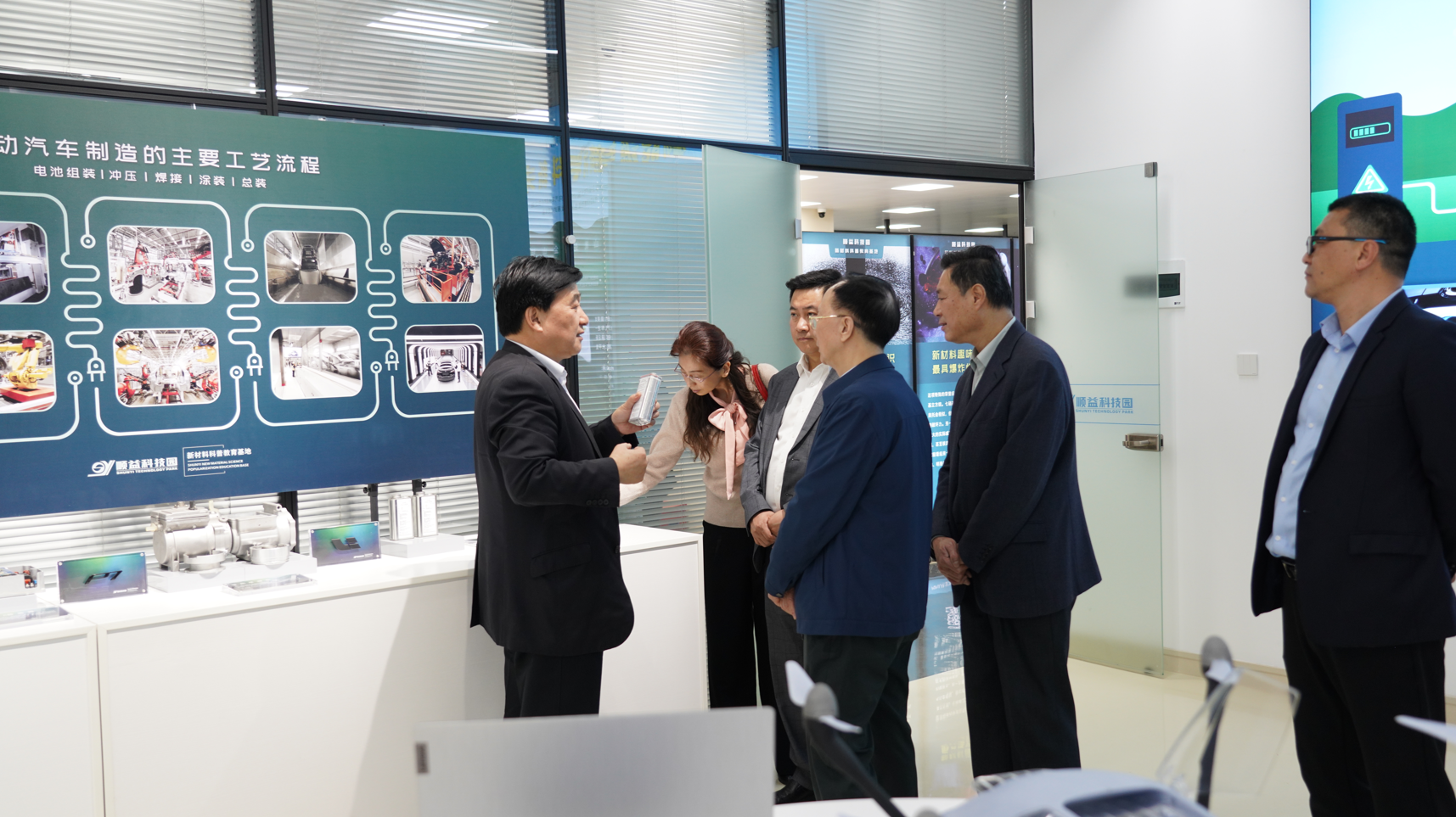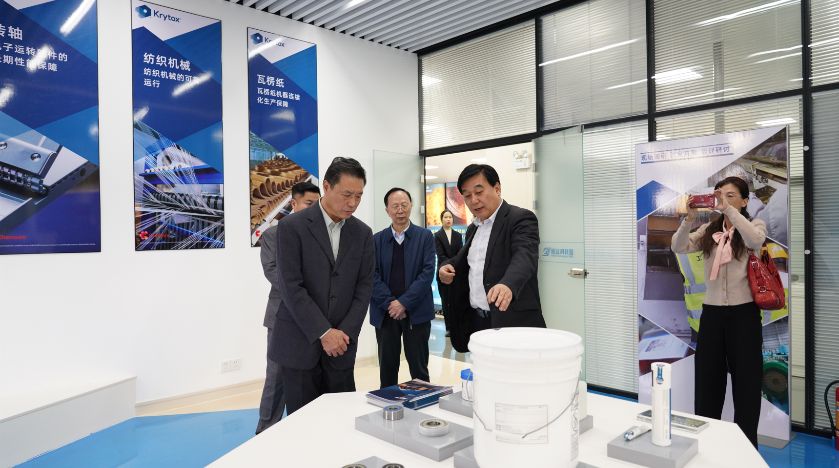 牛昌文會長等人先后參觀了順益科技園新材料應用創新基地建設與成果展、工業集成服務展示體驗中心、德國漢高樂泰體驗中心、Krytox高性能潤滑劑應用展示廳、新能源汽車新材料應用展示廳、高性能彈性體及塑料應用展示廳、特種功能涂層材料應用展示廳及順益科技園新材料科普教育基地等地。參觀人員對順益新材料新技術應用創新基地的發展取得的成績給予了充分肯定。雙方在科技園會議廳進行了深入的交流探討。