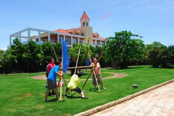 這次活動(dòng)為期一天,但節(jié)目非常豐富。上午,我們?cè)诤H獮车纳衩軑u訓(xùn)練營(yíng)進(jìn)行了團(tuán)隊(duì)PK活動(dòng)。我們分成了四個(gè)PK小組,分別是“勝利隊(duì)”、“夏鷹隊(duì)”、“阿根廷”和“喜羊羊”。活動(dòng)先以緊張刺激的“人口拍賣”熱身,被拍賣的“人口”為了讓自己被接受,也顧不上保持平日的優(yōu)雅形象了,紛紛展示著自己的“雷人面”,臺(tái)下的觀眾捧腹之余,也在祈禱自己別在下一輪“中招”啊!接著的團(tuán)隊(duì)PK賽,那真是體力、腦力、團(tuán)結(jié)一個(gè)也不能少的。不過(guò),最讓人感動(dòng)的是,隊(duì)員們對(duì)隊(duì)長(zhǎng)的支持了,看著隊(duì)員們個(gè)個(gè)竭盡全力地?fù)屜冉o隊(duì)長(zhǎng)送上鞋子、襪子、上衣、頭發(fā)、人體,以及大伙把兩位隊(duì)長(zhǎng)扛回去的奮不顧身,早已讓隊(duì)長(zhǎng)們感激得快要嚎啕大哭了,怎么會(huì)不全力以赴地帶好團(tuán)隊(duì)呢?