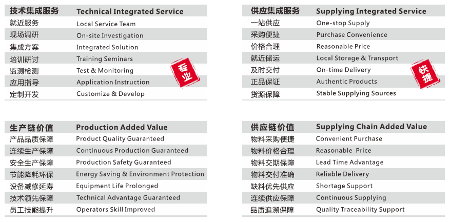 在潤滑、膠黏、密封、表面處理等領域,立足于客戶的使用和采購需求,依靠合理化、專業化、系統化的應用技術解決方案,幫助客戶降低綜合的管理成本、使用成本和采購成本,提高客戶的綜合生產經營效益。